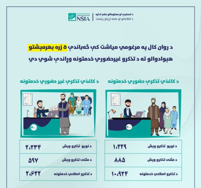 د يادونې وړ ده، چې د احصايې او معلوماتو ملي ادارې د نفوسو د احوال ثبتولو خدمتونو ریاست په حضوري او غيرحضوري بڼه د کاغذي پېژندپاڼو اړوند خدمتونو مسوولیت په غاړه لري او هېوادوالو ته د چټکو او رڼو (شفافو) خدمتونو وړاندې کولو ته ژمن دی.