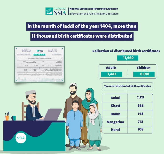 On the other hand, data show that 6,439 birth certificates were distributed through the Asan Khedmat centers in Kabul and the provinces, while the remaining 5,021 were issued by the Vital Events Registration Department in the central office and the vital statistics departments of the provincial offices. Also, from Dec 22 to Jan 22 of 2025, the NSIA distributed 2,460 death sheets across the country, with the highest numbers reported in Kabul, Helmand, Kandahar, Paktia, and Khost provinces