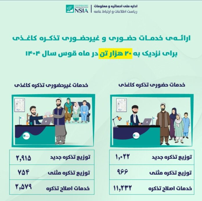 ریاست خدمات ثبت احوال نفوس اداره ملی احصائیه و معلومات، در ماه قوس سال روان برای ۱۹ هزار و ۶۶۸ تن خدمات حضوری و غیرحضوری تذکره کاغذی را ارائه کرده است.